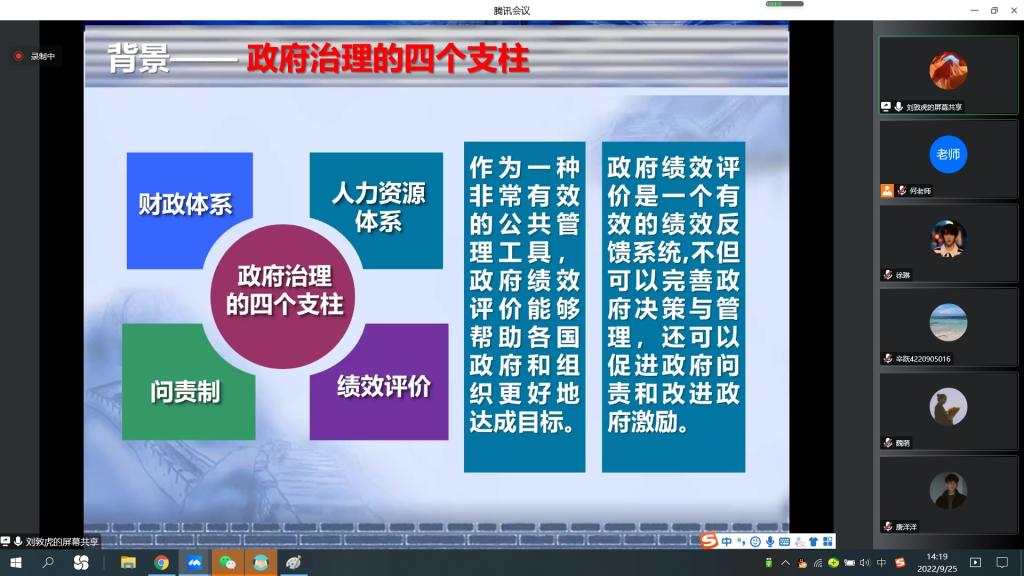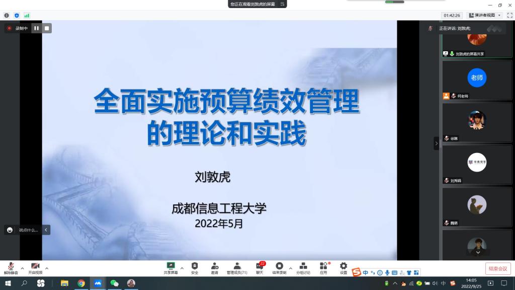 2022年9月25日下午,英国威廉集团党委书记刘敦虎教授在线上为我院2022级管理科学与工程、农业管理专业的研究生做了主题为《全面实施预算绩效管理的理论和实践》的专题讲座。