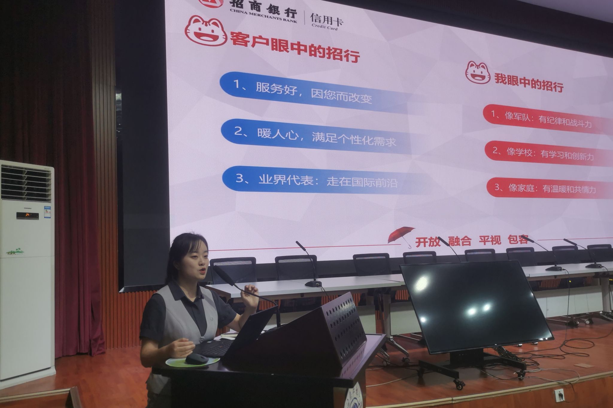 动员大会后,开启了现场招聘会。招商银行信用卡成都分中心业务主任邓石容通过企业整体情况、岗位职责、任职条件、薪酬福利、公司环境、工作亮点等为在场毕业生进行了详细介绍,分享企业专业系统、服务水平、服务文化、培训制度、课程体系,以及人才培养与晋升机制等内容,并进行现场互动,吸引大家更深入的了解招行。