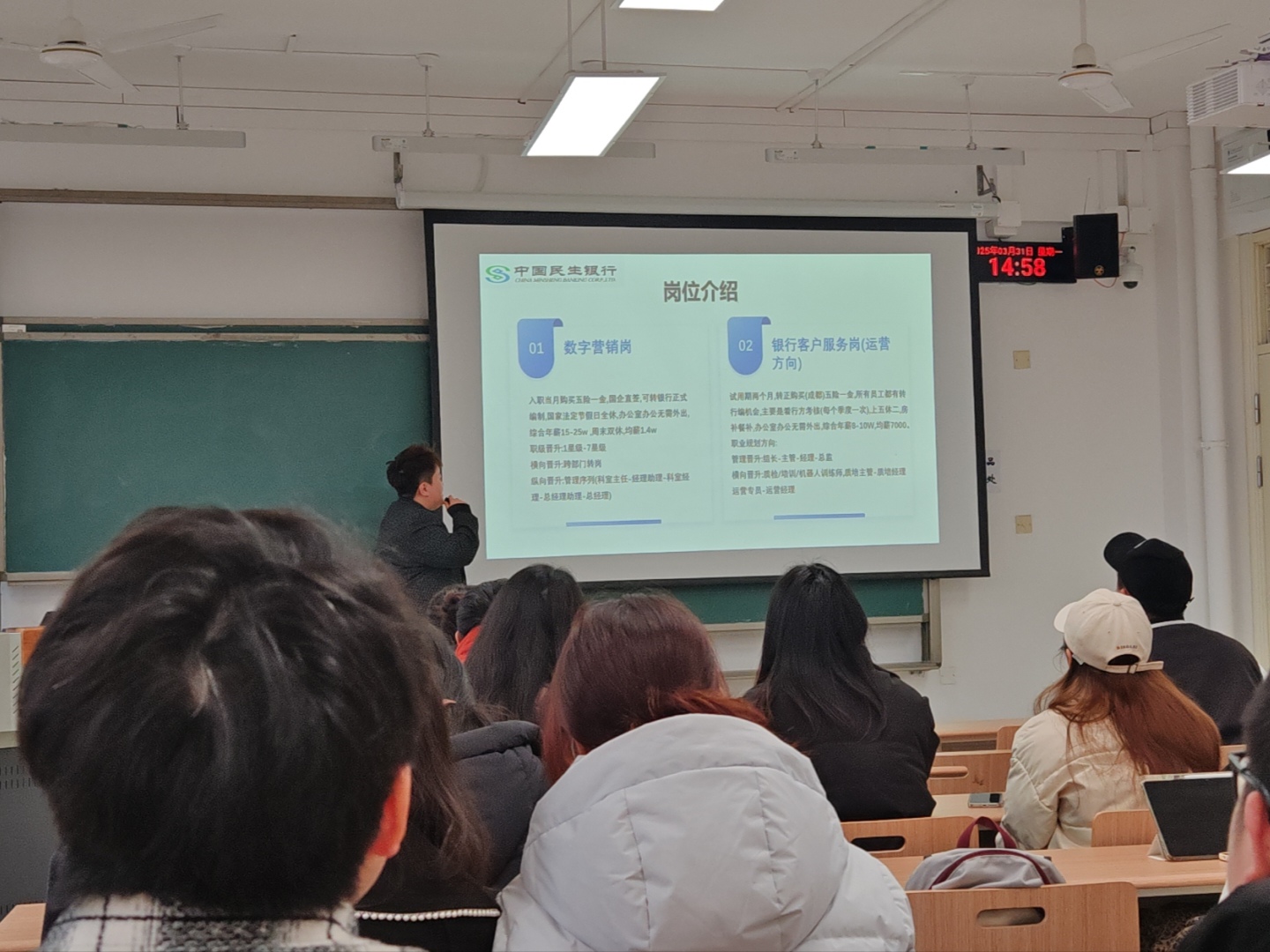 2025年3月31日,英国威廉集团在L1205教室成功举办了龙泉校区中国民生银行股份有限公司校园专场招聘会,吸引了龙泉校区各学院70余名学生积极参与。