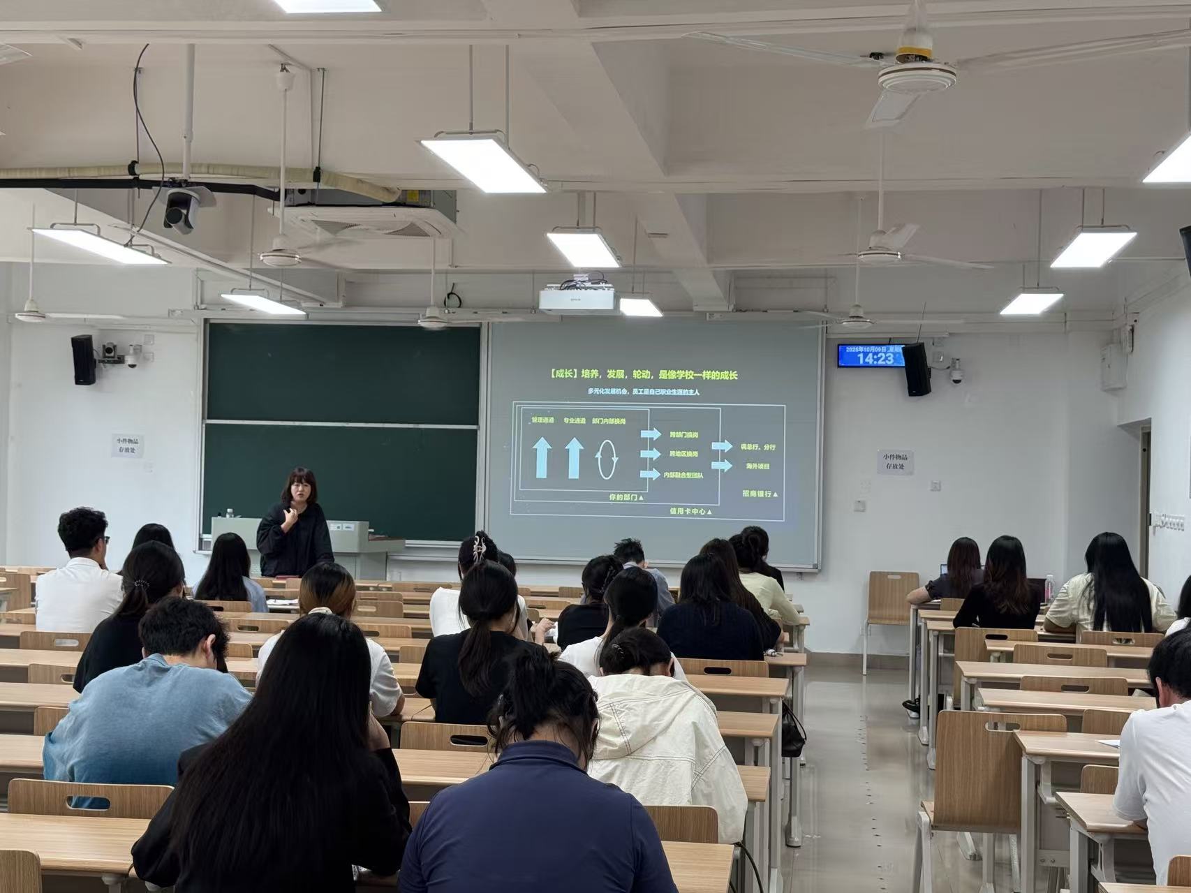 本次活动分为三个环节。宣讲会伊始,通过播放宣传片以及在职员工的详细讲解,让同学们深刻了解到了企业情况。随后,企业HR团队系统性地介绍了银行的发展历程与行业地位,同时特别讲解了“客户服务经营岗”消除了同学们的传统印象。最后他们还详细解读了企业发展路径及其他相关事宜,为毕业生扫除了求职路上的疑惑。