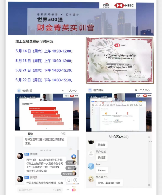 我校会计学专业ACCA国际实验班共计41位同学参加了汇丰实训营线上研习课程的学习。课程体系参考国际通用金融培训课程设置,以国内金融学原理、投资学等金融核心课程作为主要教学大纲。由汇丰银行资深职业经理人边文澎担任课程导师。在5月14日(周六)上午10:30-12:00进行了对资产价格上涨核心逻辑和公司运转原理,核心财务指标的讲解;5月15日(周日)上午10:30-12:00 讲解了资产定价、时间价值、股票价值、债券价值;5月21日(周六)下午14:00-15:3 为同学们分享了大类资产配置与风险管理的方法,并阐述了当今市场背景下的投资逻辑;在5月22日(周日)下午14:00-15:30进行了本次实训营的最后一节课,导师分享了实用投资方法,并和同学们进行了金融行业职业规划互动交流。