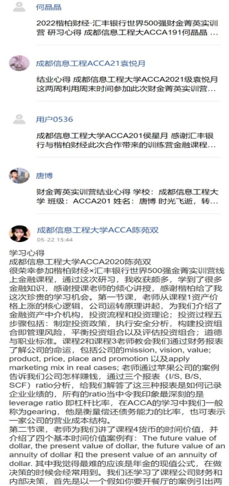 全部课程结束后,老师根据同学们的考勤记录、结业评比,以及平时的课堂学习表现与互动情况,进行了综合结业考核, 给优胜的同学颁发了汇丰银行官方金融课程证书,以示鼓励。同学们反应热切,参加课程的彭同学表示,在这次的线上课程培训中,拓展了自己前沿财经知识、提升了眼界与思维格局,感谢楷柏财经给了自己这样的机会。本次课程帮助我校ACCA学子全方位深入了解金融市场、商业银行、投融资等领域的前沿知识,促进了同学们专业能力、就业升学竞争力的提升,助力背景提升、实习就业和留学申研,具有重大意义。
