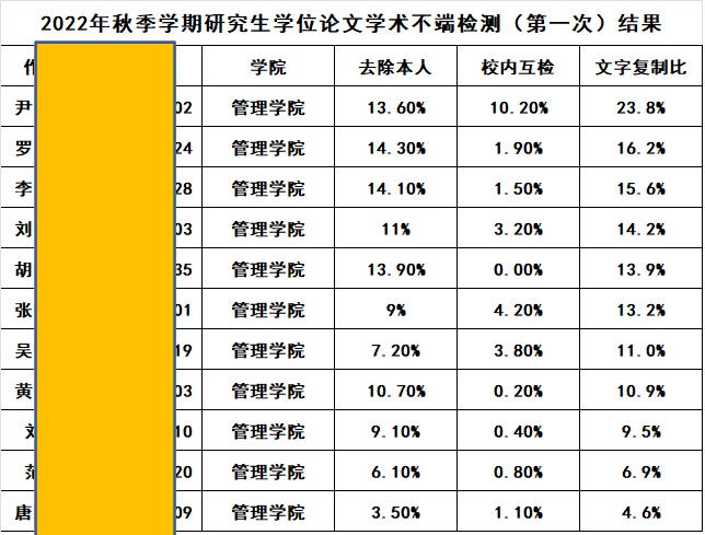 根据学校研究生处相关要求,我院对硕士学位论文进行了第一次学术不端检测,现将检测结果及有关情况通知如下: